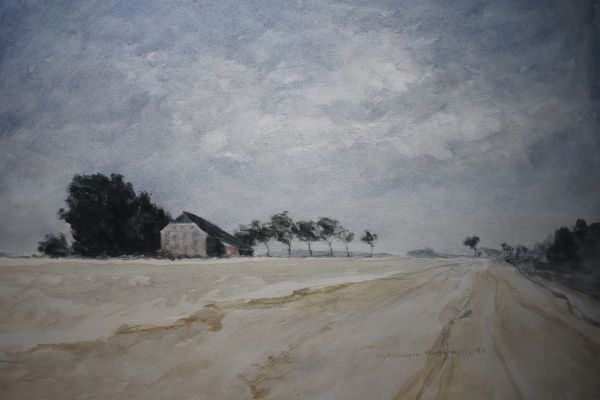 Gezicht op Oost Groningen, met boerderij waar Mart Kempers regelmatig verbleef gedurende de jaren 70-80 van de 20ste eeuw. Het werk draagt zijn signatuur en datum ’85. Zeer goede conditie.