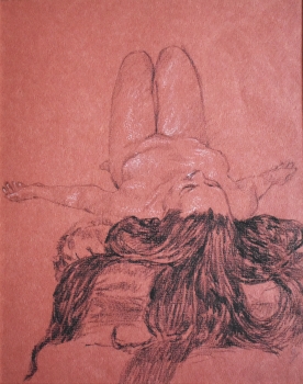 Krijttekening op donkerroze papier. 29×23 cm in passepartout gedateerd 2004.